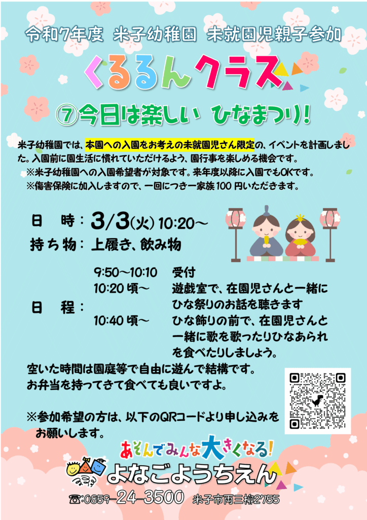※米子幼稚園への入園希望者が対象です。来年度以降に入園でもOKです。