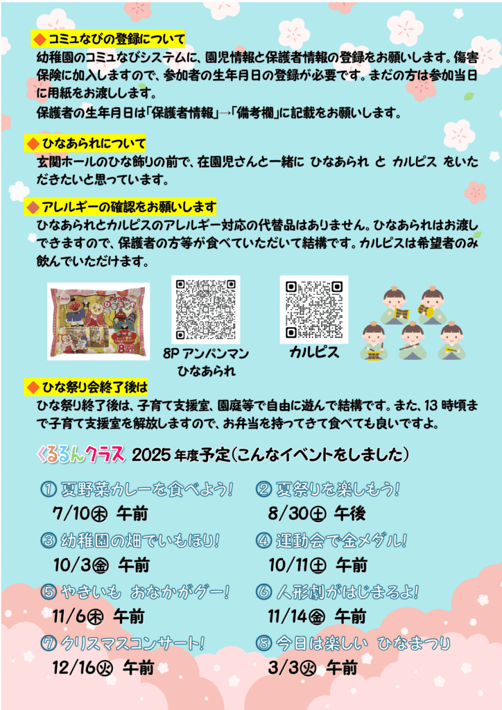 10:40頃~ ひな飾りの前で、在園児さんと一緒に歌を歌ったりひなあられを食べたりしましょう。